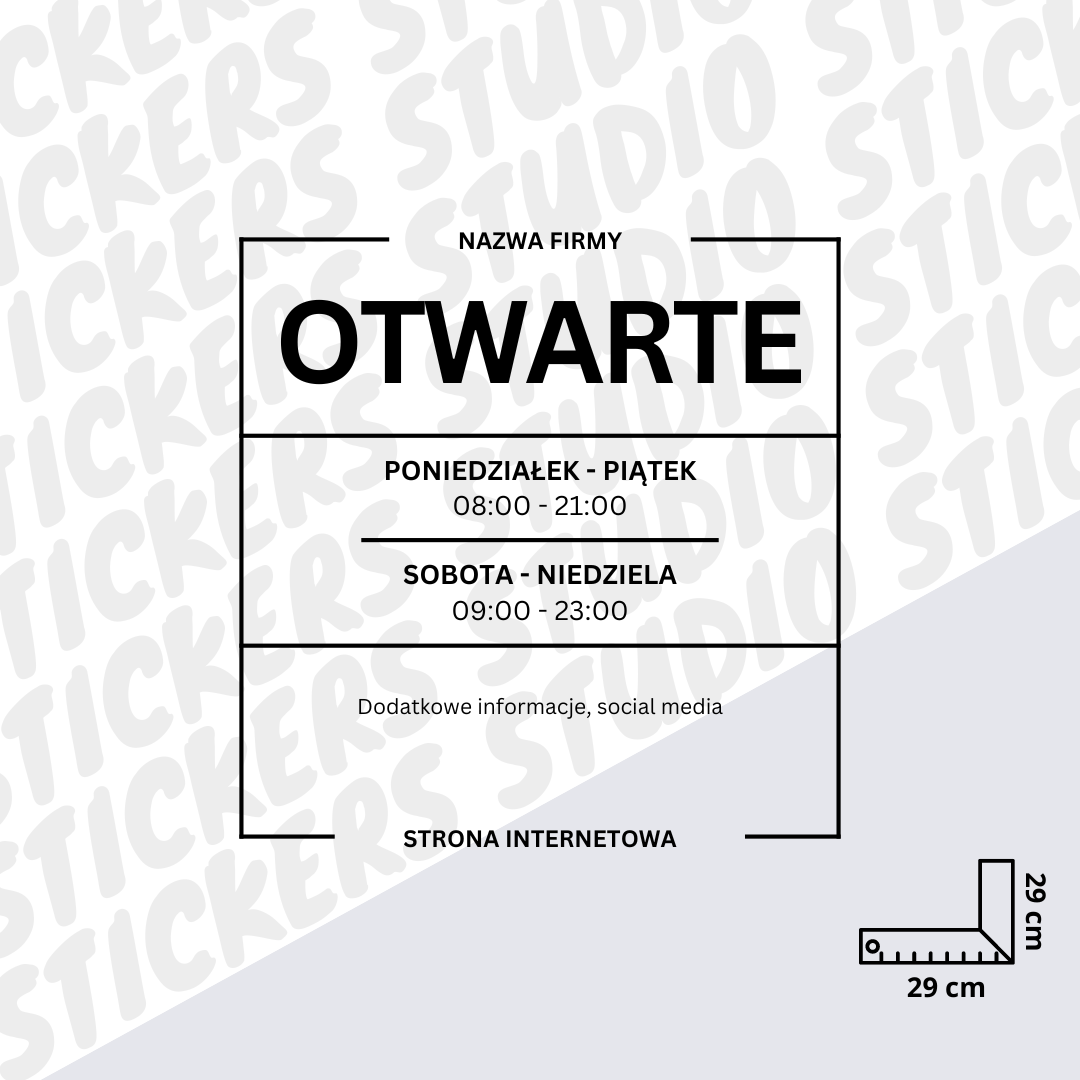 Szukasz prostego i skutecznego sposobu na poinformowanie swoich klientów o godzinach otwarcia Twojego punktu usługowego? Zamów naklejkę z godzinami otwarcia na szybę, która może być naklejona po wewnętrznej jak i zewnętrznej stronie szyby. Naklejka jest wykonana z wysokiej jakości folii samoprzylepnej, odporna na warunki atmosferyczne i promieniowanie UV. Naklejka ma wymiary 29×29 cm i jest łatwa w aplikacji. Zamów już dziś i zyskaj profesjonalny wygląd swojego punktu usługowego.